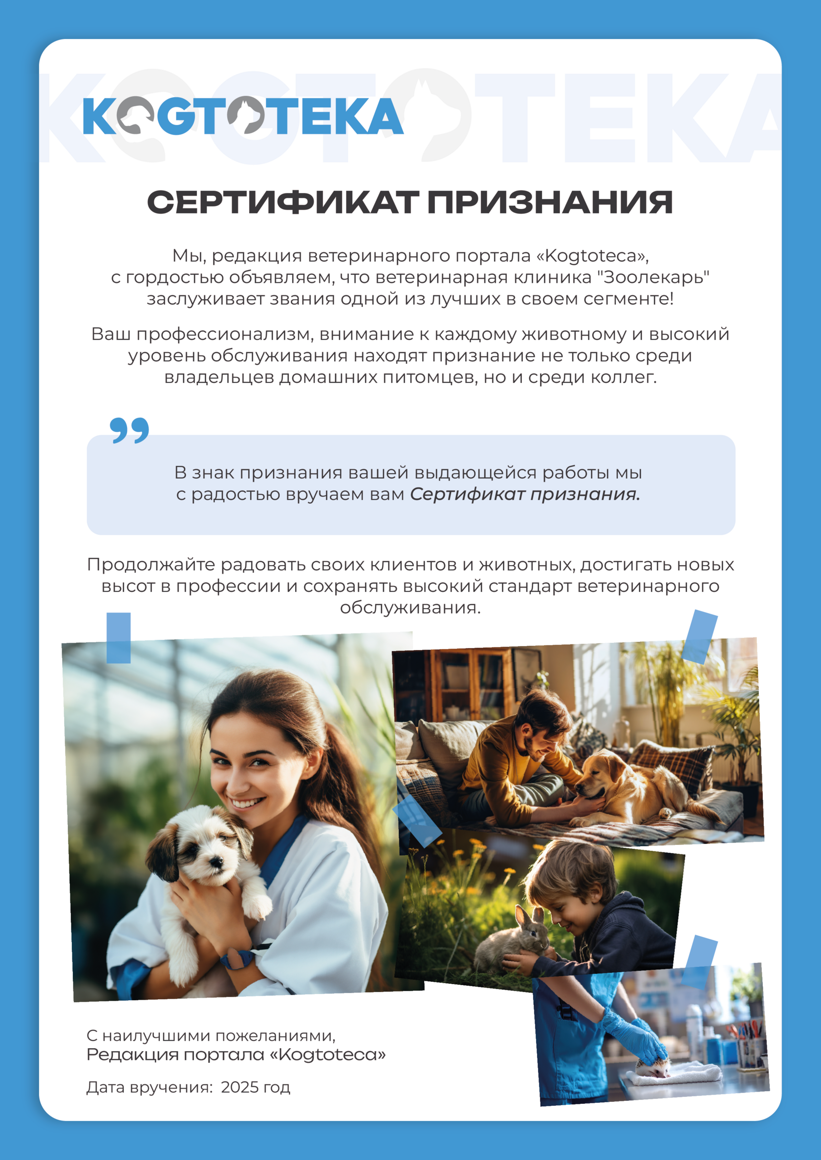 Настоящим сертификатом подтверждается, что ветеринарная клиника «Зоолекарь» заслуженно входит в список лучших клиник по версии портала KOGTOTEKA.